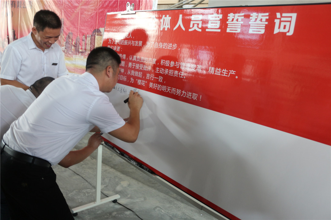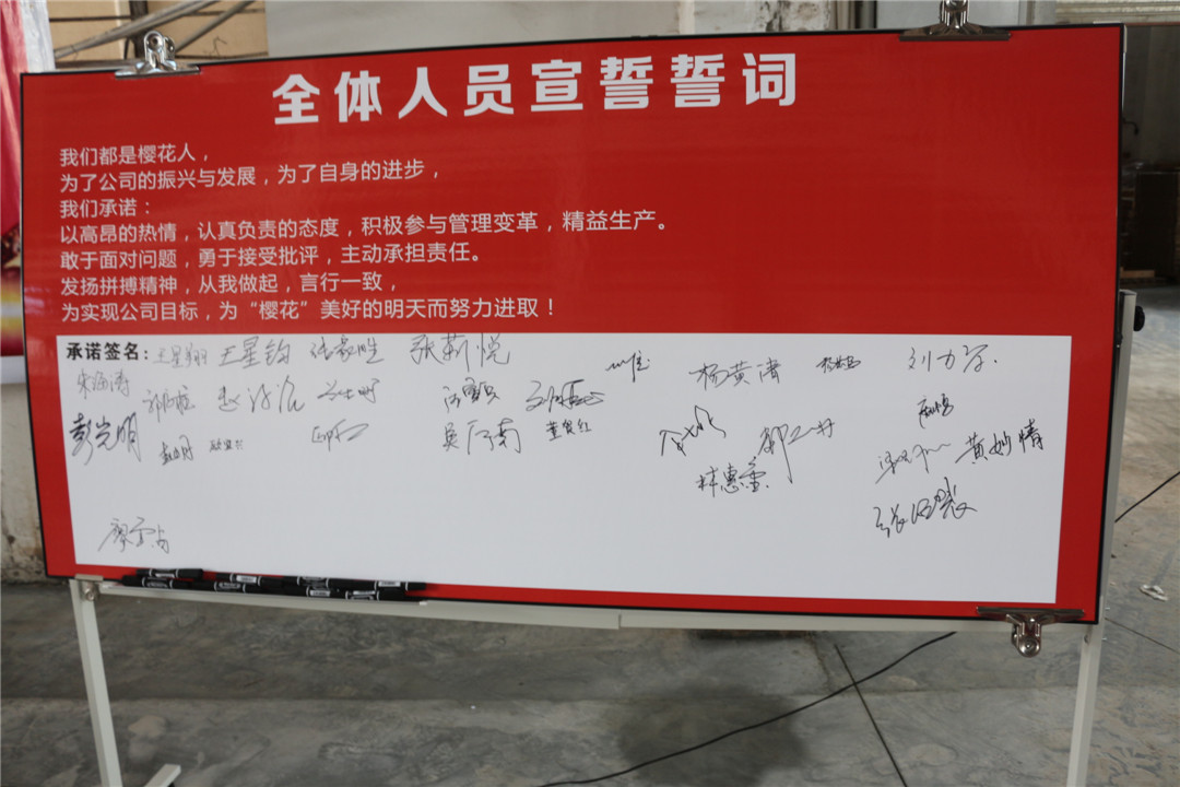 櫻花王星翔總經理在啟動大會上發(fā)表重要講話,櫻花自成立以來,曾屢創(chuàng)輝煌,也曾歷經風雨,感謝櫻花家人們一路走來的艱苦奮斗。企業(yè)的成長規(guī)律往往是發(fā)展與危機并存,為了徹底改變現(xiàn)狀,讓櫻花持續(xù)健康發(fā)展,攜手高勝進行精益變革。王總從四方面進行分享,首先,王總對此次變革寄予厚望,號召全員參與,積極配合老師工作,確保準時完成項目目標;其次,管理變革只有開始,沒有結束,誓將變革進行到底;再次,通過此次變革,能大大改善公司環(huán)境;最后,項目推行一定確保產品質量穩(wěn)定,交貨及時。