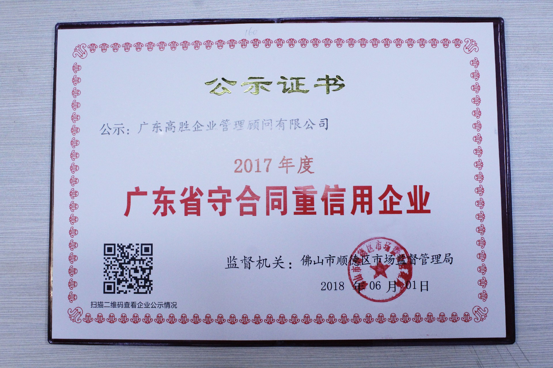 經(jīng)佛山市順德區(qū)市場監(jiān)督管理局審核批準(zhǔn),高勝咨詢獲得佛山市順德區(qū)市場監(jiān)督管理局2017年度“廣東省守合同重信用企業(yè)”公示資格證書。
